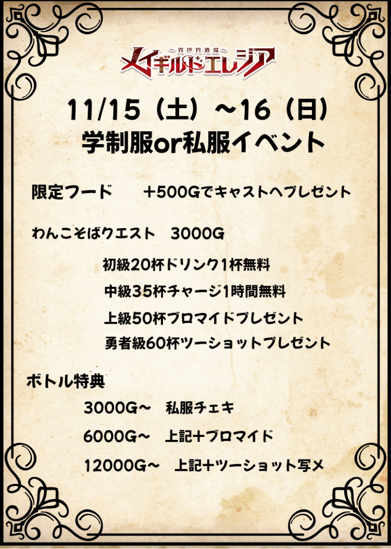 異世界コンセプトカフェ メイギルドエレジア 錦店の公式ホームページです。こちらの店舗では異世界のメイドたちがお客様をお迎えいたします。